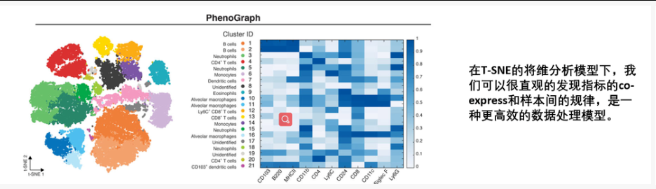 最终在施加多个维度后,实验结果以多个群落的方式进行最终的展示,群落的大小反应了细胞的占比,群落的远近和集中度反应了细胞的蛋白表达水平的高低以及相似度,这就是降维分析的结果展示。