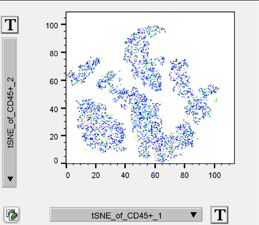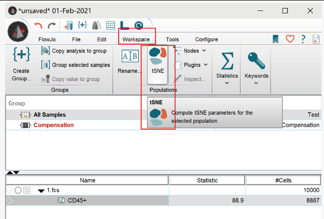 我们打开flowjo,把我们的样本拖入其中,选择样本或是进行必要的gating后(例如肿瘤细胞先圈出CD45+的门),选择合适的门,点击Workspace中的tSNE选项,然后直接点run即可: