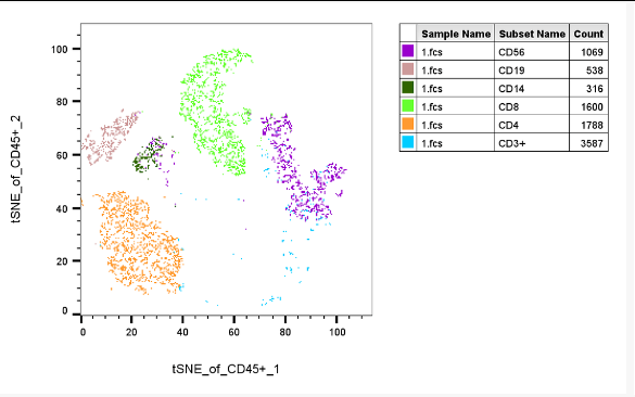 言归正传,如何使用flowjo完成数据的降维分析呢?其实非常非常简单,flowjo支持我们对当前的流式数据进行全自动的降维分析,即T-sne。T-Distributed random Neighbor embedded (tSNE)是一种降维算法,它允许在保持数据结构的同时,在更小的维数下实现复杂多维数据的可视化。