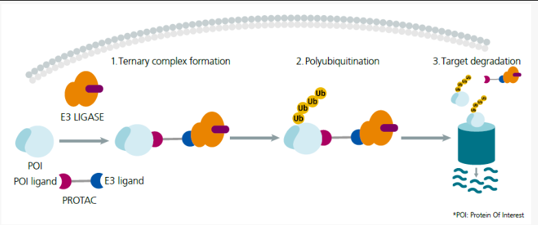 PROTAC分子两侧各有一个结合区。一个识别E3泛素连接酶,另一个识靶向目标蛋白(POI),两者由连接器(linker)连接。当连接器同事识别E3连接酶和POI时,就形成了一个三元复合物。目标蛋白被泛素化,然后被蛋白酶体降解。
