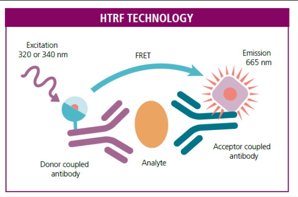 HTRF®技术基于时间分辨荧光(TRF)和荧光共振能量转移(FRET)两大技术原理,利用镧系元素较长的半衰期以及荧光基团之间的能量转移,使实验无需洗涤就能反映样品的实际情况。