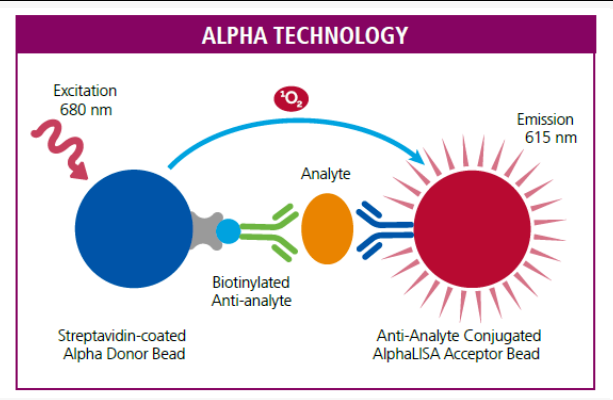Alpha® 是基于微珠标记的均相发光检测手段。当Alpha®的供体微珠和受体微珠靠近的时候,供体微珠被激发后产生的单氧分子会激发微珠受体 。