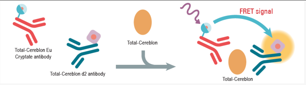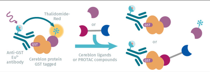 试剂盒采用标记了Eu(供体)的特异性抗GST标签的抗体与标记了XL665(受体)的Thalidomide-Red进行竞争法检测CRBN WT配体。检测原理基于HTRF技术。待检化合物与XL665标记的Thalidomide-Red竞争,从而阻止FRET信号的产生。特异性信号的强度与待检化合物的结合浓度成反比。