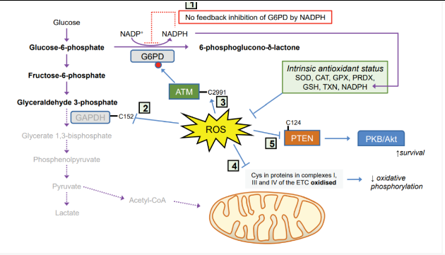 为了适应高活性氧水平,肿瘤细胞会改变硫基代谢、NADPH生成和抗氧化转录因子的活性。在启动过程中,遗传变化通过激活抗氧化转录因子或通过戊糖磷酸途径(PPP)增加NADPH,使细胞在高ROS水平下存活。在肿瘤的进展和转移过程中,肿瘤细胞通过各种方式增加NADPH来适应氧化应激,包括激活AMPK、PPP、以及减少谷氨酰胺和叶酸代谢。