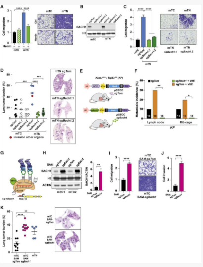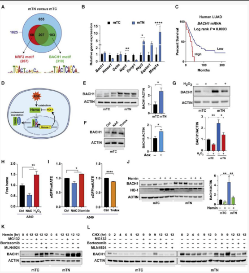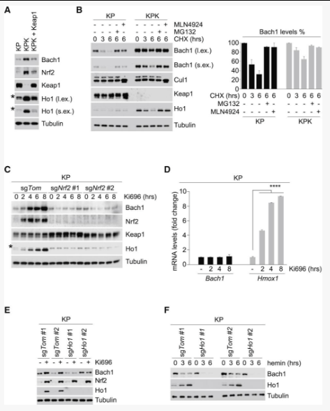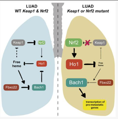 研究人员在KP(KrasLSL-G12D/+; p53flox/flox)小鼠中敲低Keap1(KPK)发现实验结果与临床数据一致,Keap1敲低可导致细胞侵袭、转移增强,同时激活Bach1和血红素氧合酶-1(Ho1)的转录。Bach1是细胞内的血红素分子传感器,能够跟随着血红素水平的波动来调控基因转录。大多数的氧化应激都会引起血红素从血红蛋白中释放,导致更多的氧化应激,因为游离的血红素催化大量自由基产生,细胞通过多种机制避免游离血红素的促氧化作用,尤其是通过快速诱导Ho1分解游离血红素。