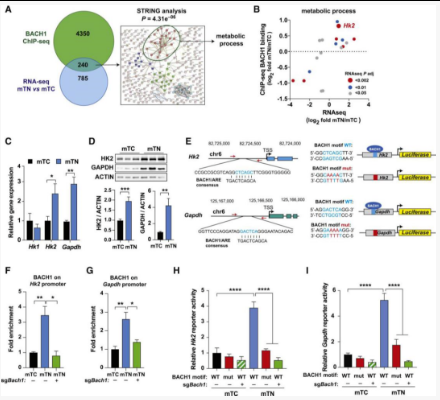 图4: 基因组占有率和转录组学分析相结合,将Hk2和Gadph鉴定为BACH1靶基因