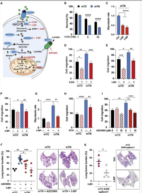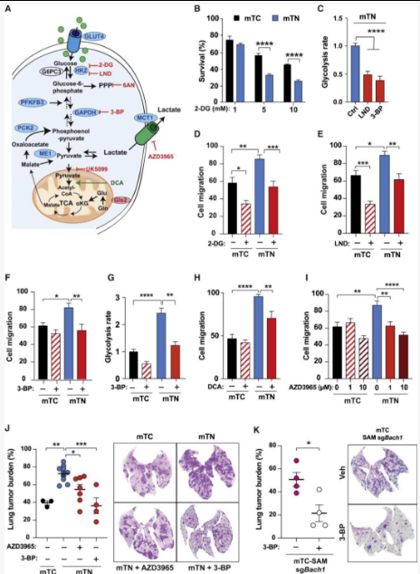 (J)静脉注射mTC和mTN细胞(0.5×105;n = 3~9小鼠/条件)3周后NSG小鼠的肺肿瘤负荷。从细胞注射的第二天开始,给小鼠给药四次(1 次/天)AZD3965(100mg / kg,灌胃)或3-BP(10mg / kg,腹膜内)。