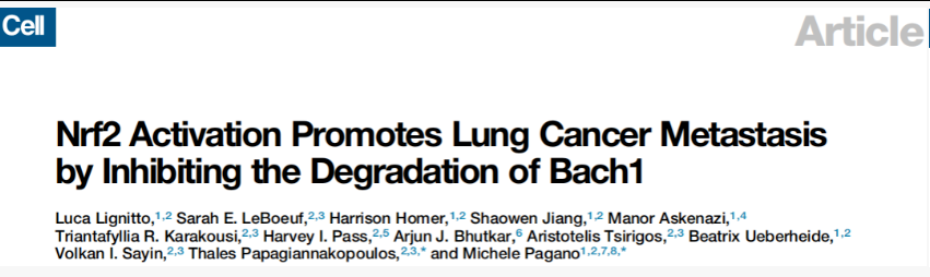 无独有偶,几乎在上篇文献发表的同时,来自纽约大学医学院的科学家团队也在Cell杂志发表文章,表明Nrf2能够通过抑制Bach1的降解导致肺癌的转移。有了上篇文章的基础,下面咱们简单介绍下该篇文章。