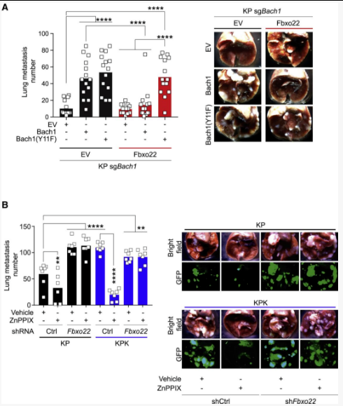 图2.过表达Fbxo22或抑制Ho1阻止Bach1驱动的肺癌转移