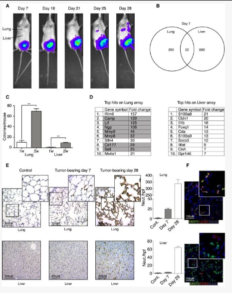 在肺组织中,一些中性粒细胞特异性的基因上调,肿瘤植入第7天肺中Ly-6G+中性粒细胞增加,且在28天持续积累,并且MMP9与中性粒细胞标志物Ly-6G+共定位(图1D-F)。