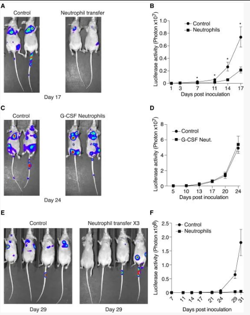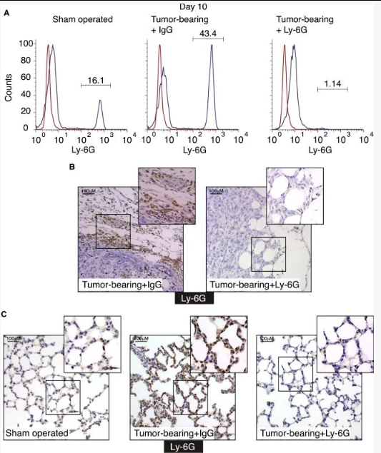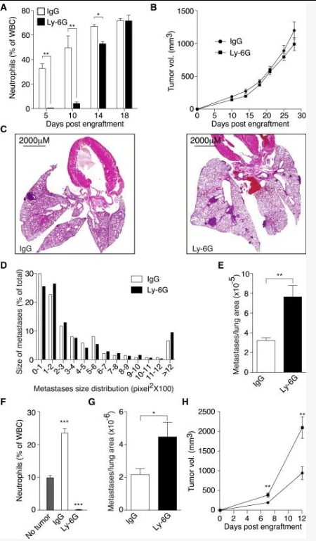 为了明确中性粒细胞在转移前的肺组织中的作用,作者通过注射白细胞特异性消耗抗体使动物中的中性粒细胞不发挥作用。与对照组相比,用Ly-6G抗体治疗的荷瘤小鼠循环中的中性粒细胞数量明显降低,在肿瘤边缘及肺组织中也明显减少(图2A-C)。