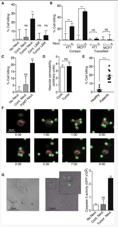 作者想进一步确定TENs的产生是否与人类疾病有关。从健康人类志愿者中分离出的中性粒细胞无细胞毒性,而在肿瘤切除或化疗之前从新诊断的乳腺癌患者中分离出的中性粒细胞具有高度细胞毒性(图5E),这表明中性粒细胞的夹带不是鼠肿瘤模型所独有的,而且发生在人类疾病的自然过程中。