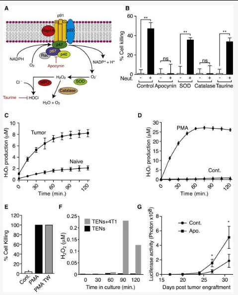 作者接下来研究了中性粒细胞杀死肿瘤细胞的机制。中性粒细胞可通过NADPH氧化酶复合物的活性生成活性氧(ROS),并通过氧化爆发诱导细胞死亡(图6A)。在apocynin存在下,TENs与肿瘤细胞的共培养可完全抑制中性粒细胞介导的肿瘤细胞杀伤;过氧化氢酶抑制细胞杀伤;次氯酸清除剂(牛磺酸)的存在并不能减少刺激的中性粒细胞对肿瘤细胞的杀伤,表明杀伤是由H2O2导致的(图6B)。TENs比对照中性粒细胞产生更多的H2O2的观察结果进一步支持了这一观点(图6C)。为了进一步了解杀伤机制,我们用PMA(一种有效的H2O2产生活化剂)处理了中性粒细胞。结果显示PMA诱导了幼稚中性粒细胞的H2O2产量急剧增加(图6D)。与4T1细胞共培养时,PMA处理的幼稚中性粒细胞具有高度的细胞毒性,可杀死接近100%的肿瘤细胞,且即使在Transwell系统中被膜隔开时也具有杀死肿瘤细胞的能力(图6E)。该结果表明,PMA刺激的中性粒细胞自发地分泌H2O2,其水平高到可以不需要直接接触就杀死肿瘤细胞。所以作者进一步假设TENs不是自发释放H2O2,而是通过接触触发了H2O2的分泌。为了检验该假设,作者进行了体外实验,尽管TENs产生H2O2增多(图6C),但当它们单独培养时,H2O2的浓度很低(图6F),这表明TENs的H2O2分泌是在肿瘤细胞存在时触发的。