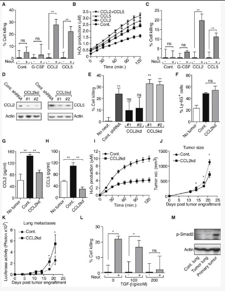 作者进一步敲低了CCL2和CCL5的表达,阻断了中性粒细胞的夹带(图7D-E),而不影响中性粒细胞的聚集(图7F)。敲除CCL2导致循环中的CCL2和CCL5水平降低(图7G-H)。与从荷瘤小鼠分离的中性粒细胞相比,CCL2敲低的荷瘤小鼠中积累的中性粒细胞没有被激活,因为其H2O2的产生减少(图7I)。