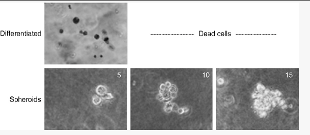 建立培养法乃基于肿瘤干细胞的生长特性,即在无血清、非贴壁的培养条件下,分化的肿瘤细胞将会死亡,而具有干性的肿瘤细胞会存活并增殖形成漂浮的细胞球,如下图。