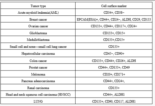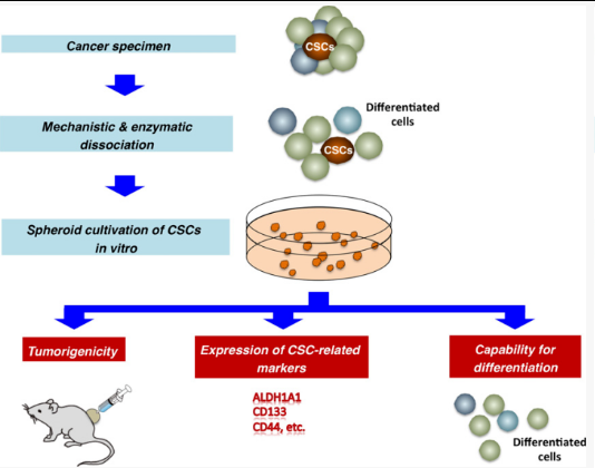 CSCs表面表达一些特定的标志物,如CD44, CD133等,一般通过流式细胞术、免疫细胞化学、免疫荧光,WB等方法进行鉴定。另外,细胞内乙醛脱氢酶(ALDH)活性也是CSCs标志物之一。