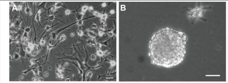 Figure 3. GBM brain tumor stem cells (BTSCs) proliferate into multipotent spheres and self-renew without exogenous mitogenic stimulation. (A, B): Phase-contrast photomicrographs demonstrate the typical appearance of GBM cells grown using the neurosphere culture system in SFM alone (without EGF þ FGF2); a monolayer of differentiated cells (A) and a floating GBM sphere (B).图片来源于 Proliferation of Human Glioblastoma Stem Cells Occurs Independently of Exogenous Mitogens GBM BTSC Sphere and Human Temporal Lobe Cell Culture