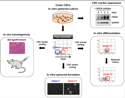 Figure 4. Evaluation of cancer stem cell (CSC)-associated phenotypes of colon spheroids derived from colorectal cancers. The CSC-associated phenotypes were validated based on CSC marker expression, flow cytometry, in vivo tumorigenicity, in vitro sp图片来源于 © 2017 The Authors. Cancer Science published by John Wiley & Sons Australia, Ltd on behalf of Japanese Cancer Association.heroid formation, and in vitro differentiation.