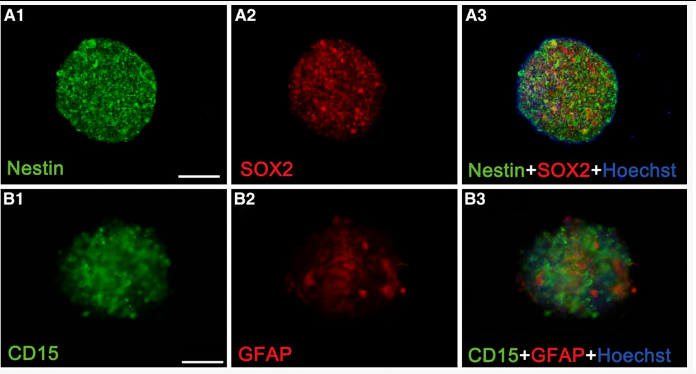 Figure 5. Expression of stem cell markers and proliferation marker in BTSCs before and after cryopreservation. Representative image of BTSCs(Brain tumor stem cells) cryopreserved in SFM and 10% DMSO. a and b stem cell markers nestin,SOX2, CD15, and GFAP expressed in BTSCs before and aftercryopreservation, 400X.图片来参考文献6