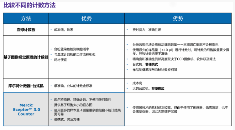 3)细胞计数器计数。库尔特原理被行业内作为细胞计数金标准,但常规的计数仪设备昂贵,操作不方便。基于以上缺陷,默克推出Scepter 3.0 手持式细胞计数器。Scepter Sensors 采用“计数金标准”库尔特原理,可以实现便捷、快速,准确地活细胞定量。