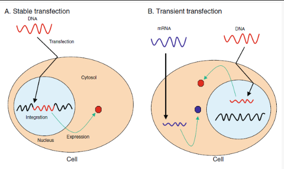 瞬时转染:外源性DNA/RNA不整合到宿主染色体中,因此一次宿主细胞中可存在多个拷贝数,产生高水平的表达,但是通常只能维持几天,多用于启动子以及其他调控元件的分析。一般在24-96小时内分析结果。核酸类型比较广泛,质粒DNA、siRNA、miRNA、和mRNA都可进行瞬时转染。