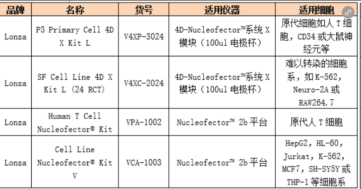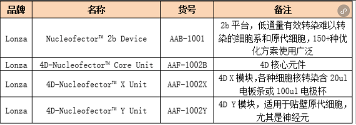 ① Nucleofector™设备,包括针对每种优化的细胞类型进行预编程的独特电参数,可将底物直接递送至细胞核和细胞质。不同的平台针对各种应用提供了不同的规格。