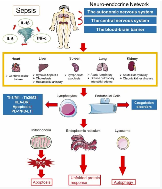 败血症不仅是全身性炎症反应或免疫失调的过程,而且还涉及体内多个器官功能的改变。如图所示在细胞和分子水平上,败血症的发病机理极为复杂,包括炎症反应失衡,免疫功能异常,线粒体损伤,凝血病,神经内分泌免疫网络异常,内质网应激,自噬和其他病理生理过程,最终导致器官功能障碍。