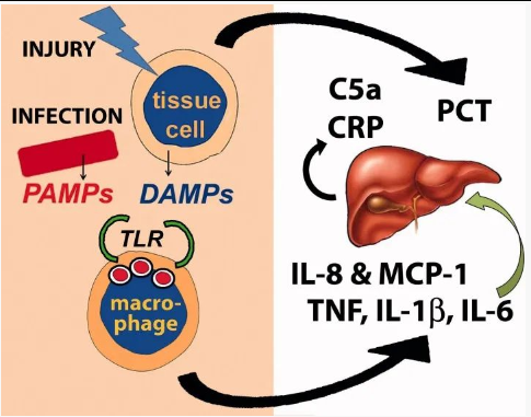 败血症始于感染或组织损伤。巨噬细胞受体(例如TLR)可以识别来自入侵生物的PAMP或来自受损组织细胞(或两者)的DAMP。这导致促炎细胞因子例如TNF,IL-1β和IL-6以及趋化因子例如IL-8和MCP-1的产生。IL-6刺激肝脏产生CRP和补体蛋白。机体中的许多细胞也会对感染和伤害产生PCT。