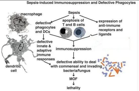败血症导致的免疫抑制和吞噬细胞缺陷。败血症会导致免疫抑制和吞噬功能缺陷,这是由于巨噬细胞和DC的耗竭或功能缺陷,T细胞和B细胞的凋亡以及抑制免疫反应的抑制性配体和受体的组织表达(主要是通过靶向T细胞)引起的。免疫抑制和吞噬细胞功能缺陷,导致无法清除入侵的细菌和真菌。