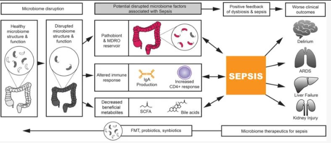 败血症患者的肠道菌群组成严重失调。一般而言,败血症患者入院后微生物群的多样性迅速下降,这一发现在其住院后期变得更加明显。微生物群组成的这些变化可以部分归因于临床干预,如肠内喂养、机械通气,以及质子泵抑制剂、阿片类药物、血管加压素,尤其是抗生素的使用。此外败血症患者胃肠蠕动减弱,肠上皮完整性受损,导致有益的厌氧菌菌群减少,导致进一步损伤肠上皮功能,有益菌移位。