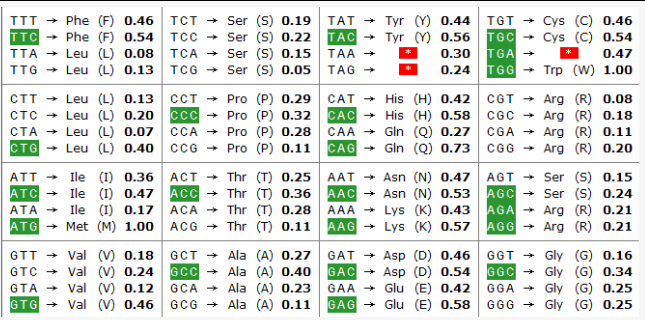 表1:Homo Sapiens 的密码子偏好性表
