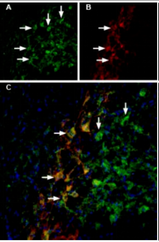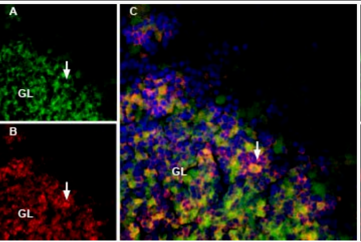 首先,将大鼠脑切片与33 nM Tertiapin-Q-ATTO Fluor-488(#STT-170-AG)(绿色)一起孵育。将这些切片与豚鼠抗GIRK2 (Kir3.2) 抗体一起孵育。A:黑质致密部(SNC)神经元(箭头)的图谱中出现Tertiapin-Q-ATTO Fluor-488结合现象。B:在SNC神经元(箭头)的图谱中检测到GIRK2染色现象(红色)。C:合并两幅图像后,显示Tertiapin-Q-ATTO Fluor-488和豚鼠抗GIRK2 (Kir3.2) 抗体对GIRK2通道的共染色。DAPI染色剂(蓝色)用于对细胞核染色。