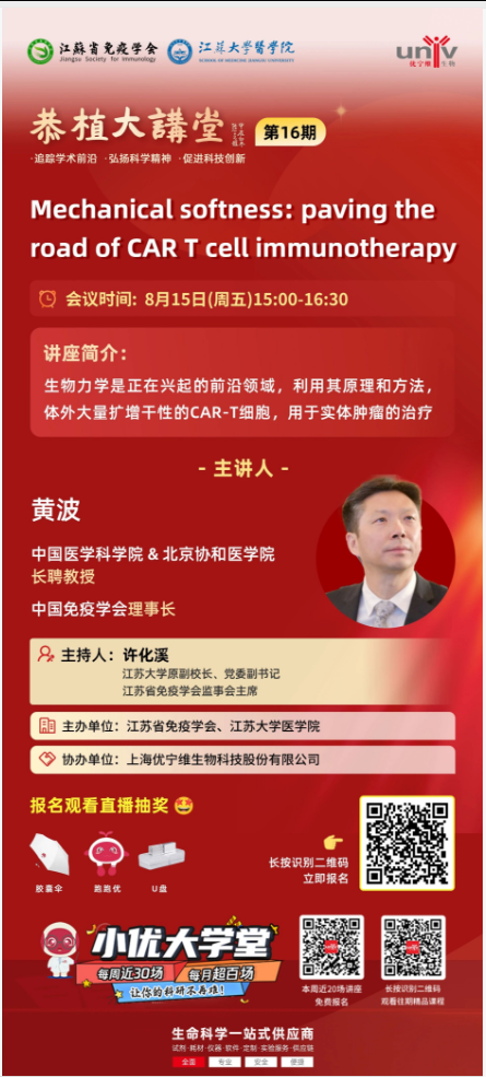 恭植大讲堂·16期将于8月15日15:00开讲。本期课堂邀请到中国医学科学院&北京协和医学院长聘教授黄波为大家带来有关《Mechanical softness: paving the road of CAR T cell immunotherapy》的主题分享干货。报名观看直播还可以参加抽奖,领取u盘、跑跑优、胶囊伞等好礼。