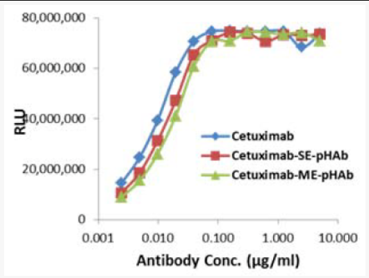 使用ELISA测定Cetuximab在与pHAb染料偶联前后的亲和力。