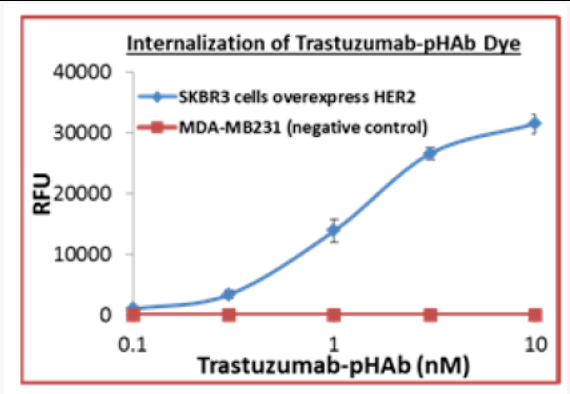 将Trastuzumab与pHAb染料偶联物的浓度进行梯度稀释后加入到96孔板中表达HER2的SKBR3细胞或MDA-MB231细胞(阴性对照)中。孵育24小时后,使用荧光读板仪测定内化抗体的荧光。