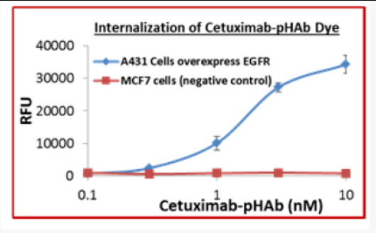 将Cetuximab与pHAb染料偶联物的浓度进行梯度稀释后加入到96孔板中表达EGFR的A431细胞或MCF7细胞(阴性对照)中。经过24小时孵育后,如上所述测定了信号。