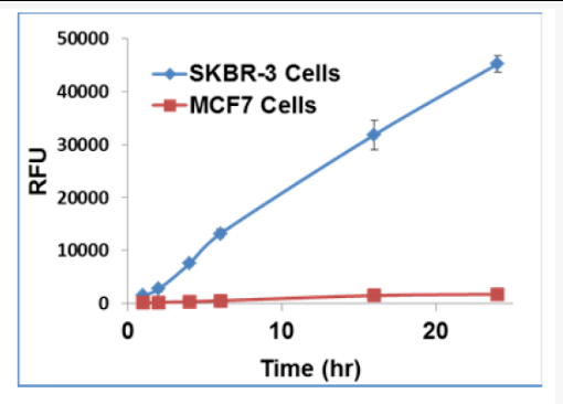 Trastuzumab-pHAb染料偶联物与表达HER2的SKBR3细胞或MCF7细胞(阴性对照)在96孔板中共同孵育不同时间。内化作用随时间的变化在96孔荧光板读板仪中读取。