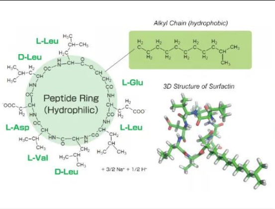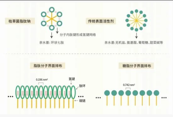 跟传统的表面活性剂相比,枯草菌脂肽钠的亲水基为环状七肽,分子内容易形成氢键网络,所以在体系中更加稳定。与其他的生物表面活性剂相比,比如与鼠李糖脂和槐糖脂相比,枯草菌脂肽钠的表面吸附量更高,分子截面积更低。分子截面积与结构相关,越小的分子截面积,在界面的排列更加紧密。