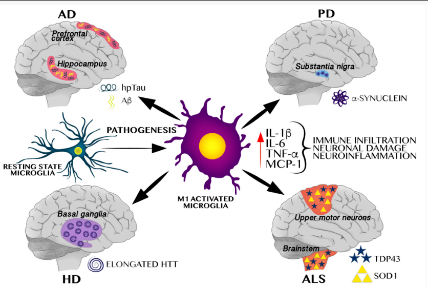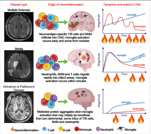 图1. 多发性硬化症、中风、阿尔茨海默病和帕金森病的神经炎症成因