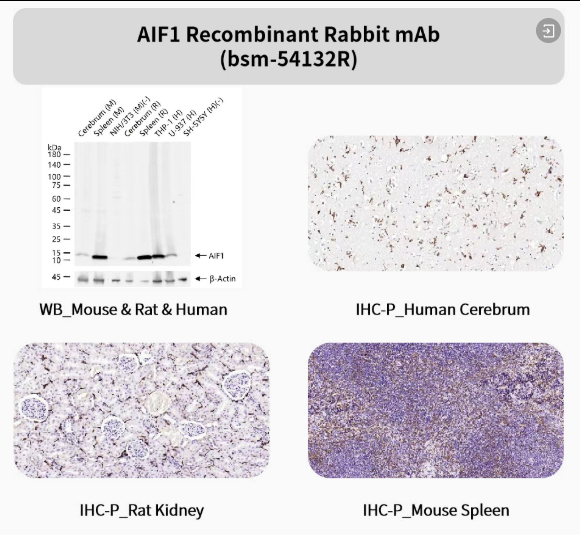 AIF1是一种细胞质钙结合蛋白,主要表达于巨噬细胞、小胶质细胞和T淋巴细胞等免疫细胞,分布于脑、肾、肝等组织。其生理功能包括调控吞噬作用、细胞骨架重塑(F-actin)及免疫细胞(如巨噬细胞、T细胞)的活化、迁移,同时参与神经稳态维持与小胶质细胞功能调节。AIF1可作为小胶质细胞和巨噬细胞的特异性标记物,用于免疫组织化学染色,帮助诊断神经系统疾病、肾脏疾病、自身免疫性疾病等。AIF1可作为单核/DC来源肿瘤的诊断标志物。靶向干预AIF1(如反义寡核苷酸)可改善肾脏修复和心脏功能,提示其治疗潜力。