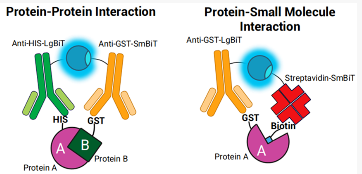 NanoBiT® 萤光素酶是一种结构互补性报告基因,非常适合进行相互作用研究。NanoBiT® 系统的大亚基(LgBiT;18kDa)和小亚基(SmBiT;11 氨基酸肽),它们分别针对常见蛋白标签的抗体(或链霉亲和素)偶联。当抗标签-LgBiT和抗标签-SmBiT被添加到带有相应标签的相互作用蛋白对时,它们会形成一个功能性酶,在底物存在的情况下产生生物发光信号。