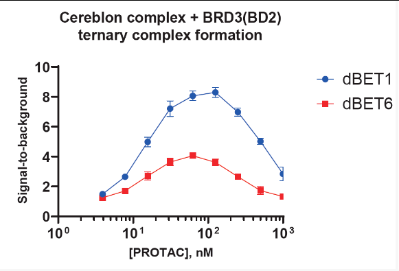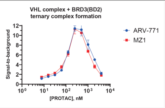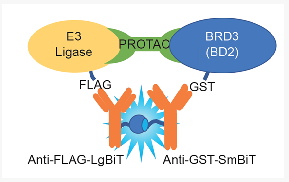 以BRD3(BD2)作为目标蛋白,我们使用Lumit® Anti-Tag Protein Interaction Reagents中的Lumit® Anti-DYKDDDDK-LgBiT(识别常用于标记蛋白质的 FLAG® 标签)和Anti-GST-SmBiT监测了PROTAC介导的三元复合物(Cereblon复合物和VHL复合物)形成。