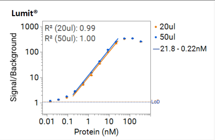 上图:50µl与20µl Lumit® Anti-Tag 反应。按照Lumit® Anti-Tag技术手册,在96孔半区板中用Lumit® Anti-6His SmBiT 和Anti-DYKDDDDK LgBiT配制50µl(标准)反应体系,在96孔低体积板中配制20µl反应体系(方法同上,省略抑制剂步骤)。发光信号在GloMax® Discover System上检测。数据表示为平均信背比±标准差(n=3)。检测限(LoD)=平均背景RLU+(3×标准差),以水平线标示(LoD/平均背景RLU)。拟合线对应50µl或20µl反应体系的线性范围(21.8-0.22nM)。