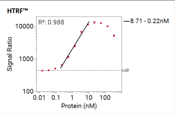 下图:HTRF 反应。如方案所述1,在96孔低体积板中用抗6His Tb Cryptate Gold单抗和抗FLAG® d2单抗配制20µl(标准)反应体系。HTRF反应在具备时间分辨荧光能量转移(TR-FRET)滤光功能的Tecan Spark® Cyto酶标仪上完成检测。信号比=(665nm信号/620nm信号)×104。数据表示为平均信号比±标准差(n=3)。LoD=平均背景信号比+(3×标准差),以水平线标示。拟合线对应线性范围(8.71-0.22nM)。