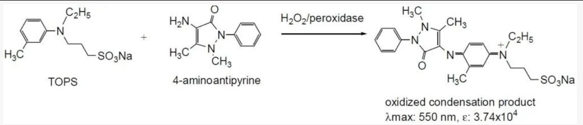 Trinder反应原理为被测物质通过酶作用产生的过氧化氢(H2O2)在4-氨基安替比林(4-AAP)、过氧化物酶(POD)的存在下,可生成红色醌亚胺化合物,其生成物色泽深浅在一定范围内与代谢物浓度呈正比