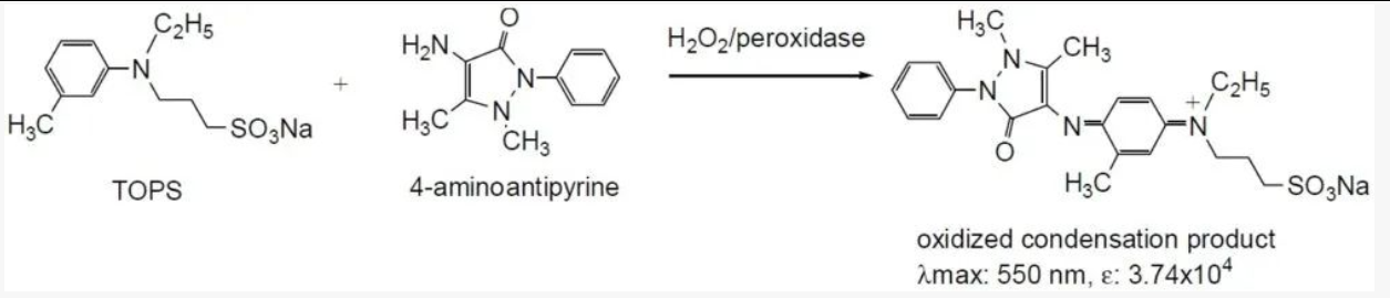 新型Trinder's 试剂水溶性更高,颜色反应产物的紫外吸收波范围更大,反应需要的酸碱范更广,反应也更加灵敏,因此在生化反应中的实用性更好。新型Trinder's 试剂包括TOOS,MADB,ADOS,HDAOS等,系高水溶性苯胺衍生物,是酶光度法检测血糖、血脂、肝功能、肾功能等生化指标的常用试剂。