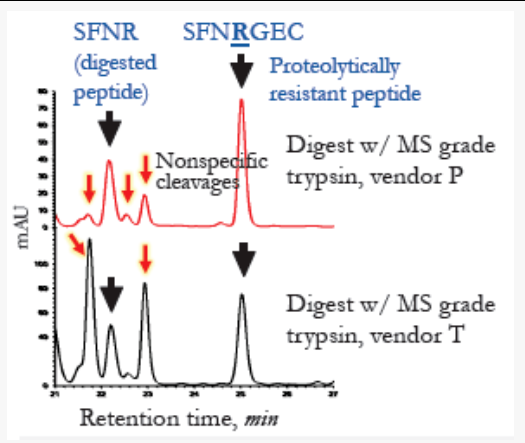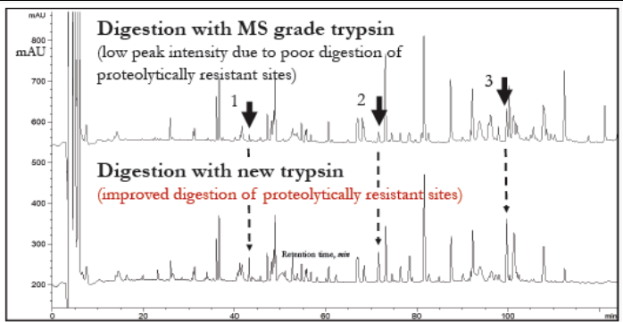 MS级胰蛋白酶的蛋白水解效率中等。即便胰蛋白酶与蛋白的比例为1:10,蛋白水解抗性位点的消化也不完全。
