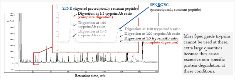 增加胰蛋白酶:Ab比例并过夜消化帕尼单抗抗体,然后进行RP-HPLC-UV(Agilent 1200)分析。