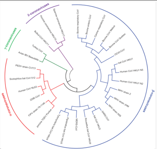 冠状病毒常感染哺乳动物和鸟类的上呼吸道和胃肠道,根据遗传差异可分为α、β、γ和δ冠状病毒四种,详情见下图。根据系统发育证据、基因含量和基因组特征,β-冠状病毒属可分为a、b、c和d谱系