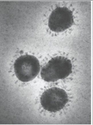 冠状病毒是直径约120~160纳米的球形包膜颗粒,其特征性外观可以在电子显微照片(如下图所示)中观察到,由从病毒膜包膜突出的病毒尖峰蛋白引起,并在病毒离子表面周围形成冠。